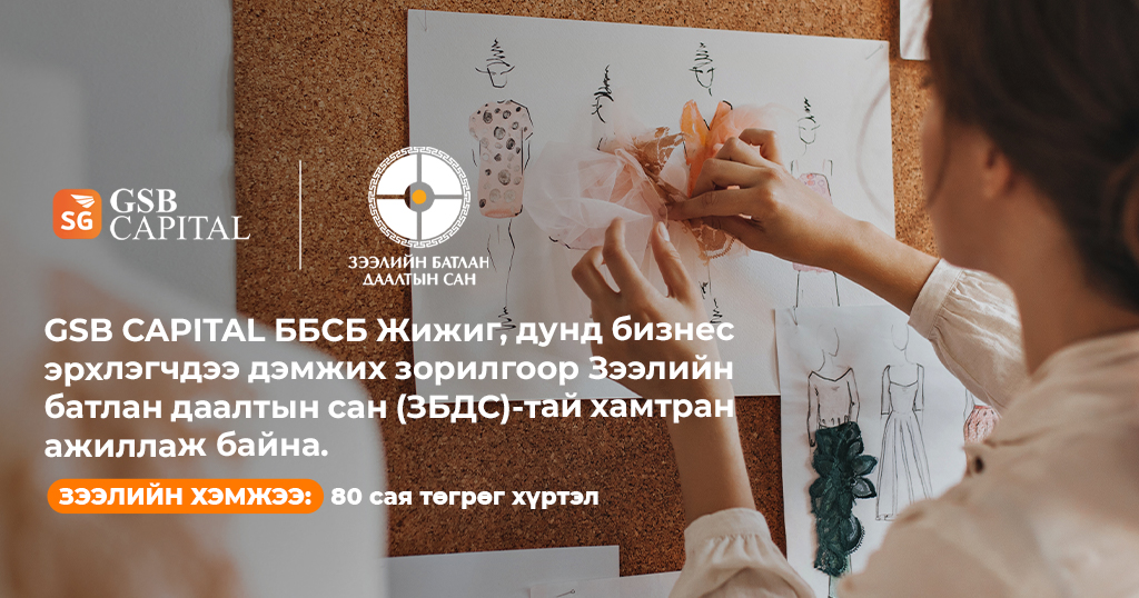 GSB CAPITAL ББСБ ХХК Зээлийн батлан даалтын сан-тай хамтран ажиллаж байна. Зээлийн барьцаа хөрөнгө хүрэлцэхгүй байгаа бизнесийн үйл ажиллагаагаа өргөжүүлэх хүсэлтэй бизнес эрхлэгч та Зээлийн батлан даалтын сан /ЗБДС/ -аар богино хугацаанд батлан даалт гаргуулан зээл авах боломжтой. Зээлийн хэмжээ: 80 сая төгрөг хүртэл